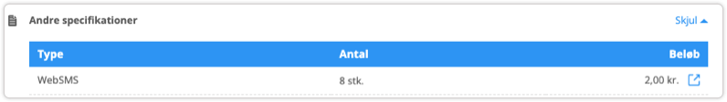 Man kan følge forbruget på Kundelogin > Forbrug > fanen Detaljeret overblik. Her vælger man medarbejderen, man ønsker at se forbruget for, klikker på Andre specifikationer, og ser beløbet for WebSMS.