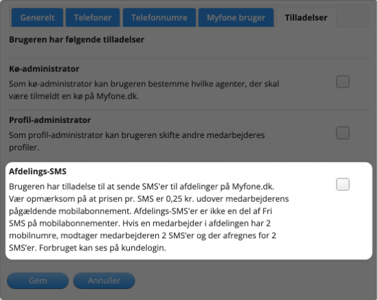 3. Klik på fanen Tilladelser, og sæt flueben i boksen ud for Afdelings-SMS.