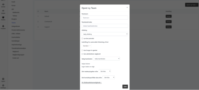 Når du har valgt hvilke afdelinger der er skal bruges af jeres CallAI brugere, kan du tilgå indstillinger i CallAI og oprette Teams der er tilknyttet de prædefinerede afdelinger. For at gøre det, skal du klikke på Indstillinger og vælge Teams. Vælg derefter Opret nyt team: