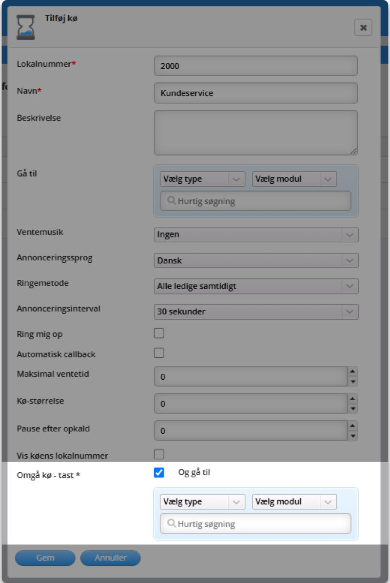 | 3. Gå til | Her kan du vælge, hvad køen skal viderestille til, hvis den maksimale ventetid er nået, kø-størrelse eller hvis der ingen er tilmeldt i køen. Du behøver ikke vælge type for at slå et lokalnummer op. Dette kan bruges, hvis du har mange lokalnumre, der hedder det samme, men har forskellige funktioner. |